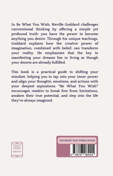 In Be What You Wish, Neville Goddard offers a transformative guide to personal empowerment and fulfillment through the power of imagination and self-perception. Drawing on his profound understanding of metaphysics and the law of assumption, Goddard explores the idea that one's inner beliefs and mental imagery are the keys to manifesting desired outcomes in life. The book presents a compelling argument that reality is shaped by our inner world. Goddard teaches that by assuming the feeling of the wish fulfilled and vividly imagining oneself in the desired state, individuals can align their external reality with their internal desires. He emphasizes that this process is not about wishful thinking but about a deep, heartfelt conviction that what one desires is already achieved. Goddard's teachings are rooted in the concept that the power of creation resides within each person. By altering one's self-concept and embracing the emotions and beliefs associated with their wishes, individuals can experience profound changes in their lives. The book provides practical exercises and techniques for harnessing the creative power of the mind, including visualization practices and affirmations, to bring about desired changes and manifest personal goals. With its blend of spiritual insight and practical advice, Be What You Wish serves as both a philosophical exploration and a hands-on manual for anyone seeking to unlock their potential and create the life they truly desire. Goddard's writing encourages readers to look within, transform their self-perception, and embrace the reality they wish to experience.
