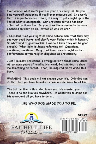 Ever wonder what God’s plan for your life really is? Do you find yourself wondering if you’ll ever measure up? In a world that is so performance driven, it’s easy to get caught up in the lies of what is acceptable. Our Christian culture has been affected by these lies. Do you think there seems to be more emphasis on what we do, instead of who we are? Jesus said, "Let your light so shine before men, that they may see your good works, and glorify your Father which in heaven." So what kind of good works? How do I know they will be good enough? What light is Jesus referring to? Questions, questions, questions. Many that have been brought on by a performance driven religion disguised as Christianity. Just like many Christians, I struggled with these same issues. After many years of reading His word, God started to show me something different. Then, He inspired me to write this book. WARNING: This book will not change your life. Only God can do that, but you have to make a conscious decision to let Him. The bottom line is this. God loves you. He created you. There is no one like you anywhere. He wants you to shine for His glory, and all you have to do is... BE WHO GOD MADE YOU TO BE.