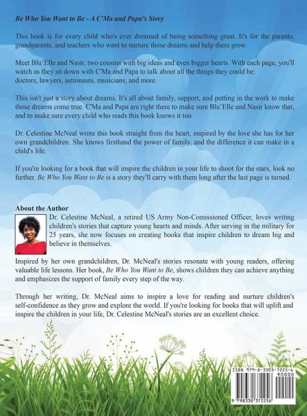 This book is for every child who's ever dreamed of being something great. It's for the parents, grandparents, and teachers who want to nurture those dreams and help them grow. Meet Bluelle and Nasir, two cousins with big ideas and even bigger hearts. With each page, you'll watch as they sit down with C'Ma and Papa to talk about all the things they could be: doctors, lawyers, astronauts, musicians, and more. This isn't just a story about dreams. It's all about family, support, and putting in the work to make those dreams come true. C'Ma and Papa are right there to make sure Bluelle and Nasir know that, and to make sure every child who reads this book knows it too. Dr. Celestine McNeal wrote this book straight from the heart, inspired by the love she has for her own grandchildren. She knows firsthand the power of family, and the difference it can make in a child's life. If you're looking for a book that will inspire the children in your life to shoot for the stars, look no further. Be Who You Want to Be is a story they'll carry with them long after the last page is turned. About the Author Dr. Celestine McNeal, a retired US Army Non-Comissioned Officer, loves writing children's stories that capture young hearts and minds. After serving in the military for 25 years, she now focuses on creating books that inspire children to dream big and believe in themselves. Inspired by her own grandchildren, Dr. McNeal's stories resonate with young readers, offering valuable life lessons. Her book, Be Who You Want to Be, shows children they can achieve anything and emphasizes the support of family every step of the way. Through her writing, Dr. McNeal aims to inspire a love for reading and nurture children's self-confidence as they grow and explore the world. If you're looking for books that will uplift and inspire the children in your life, Dr. Celestine McNeal's stories are an excellent choice. Visit www.drcelestinemcneal.com for more family, books, and fun.