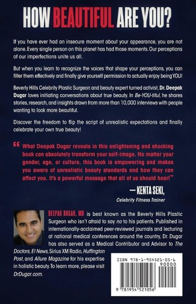 How Beautiful Are You? If you have ever had an insecure moment about your appearance, you are not alone. Every single person on this planet has had those moments. Our perceptions of our imperfections unite us all. But when you learn to recognize the voices that shape your perceptions, you can filter them effectively and finally give yourself permission to actually enjoy being YOU! Beverly Hills Celebrity Plastic Surgeon and beauty expert turned activist, Dr. Deepak Dugar loves initiating conversations about true beauty. In Be-YOU-tiful, he shares stories, research, and insights drawn from more than 10,000 interviews with people wanting to look more beautiful. Discover the freedom to flip the script of unrealistic expectations and finally celebrate your own true beauty!