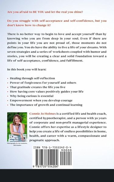 Are you afraid to BE YOU and let the real you shine? Do you struggle with self-acceptance and self-confidence, but you don't know how to change it? There is no better way to begin to love and accept yourself than by knowing who you are from deep in your soul. Even if there are points in your life you are not proud of, those moments do not define you. You do have the ability to live a life of your dreams. With seven strategies and a series of worksheets coupled with humor and stories, you will be creating a clear and solid foundation toward a life of self-acceptance, confidence, and fulfillment. In this book you will learn: 1. Healing through self-reflection2. Power of forgiveness for yourself and others3. That gratitude creates the life you live4. How having core values positively guides your life5. Why being curious is essential6. Empowerment when you develop courage7. The importance of growth and continual learning Connie Jo Holmes is a certified life and health coach, certified hypnotherapist, and a person with 30 years of corporate and non-profit managerial experience. Connie offers her expertise as a lifestyle designer to help you create a life of endless possibilities in home, health, and career with a warm, compassionate and pragmatic approach.