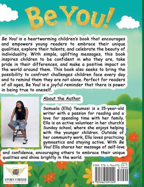 Be You! is a heartwarming children's book that encourages and empowers young readers to embrace their unique qualities, explore their talents, and celebrate the beauty of individuality. With simple, uplifting messages, this book inspires children to be confident in who they are, take pride in their differences, and make a positive impact on the world around them. This book also seeks to bring the possibility to confront challenges children face every day and to remind them they are not alone. Perfect for readers of all ages, Be You! is a joyful reminder that there is power in being true to oneself. About the Author Samuella (Ella) Twumasi is a 15-year-old writer with a passion for reading and a love for spending time with her family. Ella is an active volunteer in her church's Sunday school, where she enjoys helping with the younger children. Outside of her community work, Ella loves practicing gymnastics and staying active. With Be You! Ella shares her message of self-love and confidence, encouraging others to embrace their unique qualities and shine brightly in the world.