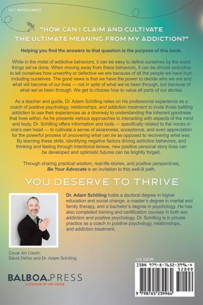 While in the midst of addictive behaviors, it can be easy to define ourselves by the worst things we've done. When moving away from addictive behaviors, it can be almost seductive to tell ourselves how unworthy and defective we are because of all the people we have hurt, including ourselves. The good news is that we have the power to decide who we are and what will become of our lives-not in spite of what we've been through, but because of what we've been through. We get to choose how to value all parts of our stories. As a teacher and guide, Dr. Adam Schilling relies on his professional experience as a coach of positive psychology, relationships, and addiction treatment to invite those battling addiction to use their experiences as a doorway to understanding the inherent goodness that lives within. As he presents various approaches to interacting with aspects of the mind and body, Dr. Schilling offers information and tools, specifically related to the voices in one's own head, to cultivate a sense of awareness, acceptance, and even appreciation for the powerful process of uncovering what can be as opposed to recovering what was. By learning these skills, identifying negative factors driving addictive behaviors, and thinking and feeling through intentional lenses, new positive personal story lines can be developed and optimistic futures can be brightly forged. Through sharing practical wisdom, real-life stories, and positive perspectives, Be Your Advocate is an invitation to this well-lit path.