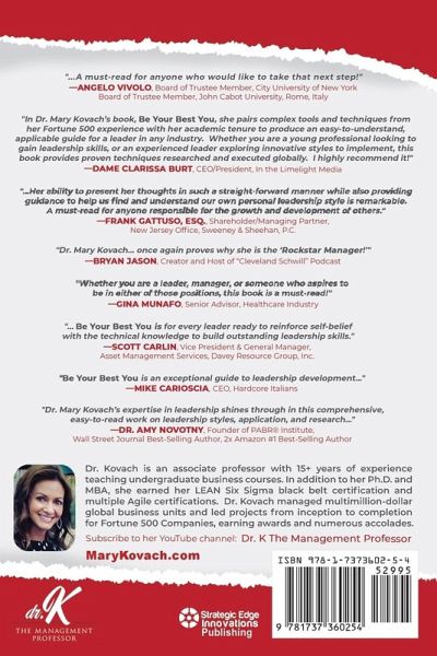 This book is next-level leadership. In Be Your Best You, the #1 international best-selling and award-winning author, Dr. Mary Kovach, delivers the full leadership spectrum. There are three unique parts to this book, each contributing different aspects of leadership. Part 1 is an overview of nine different leadership styles and theories. They include the Trait Theories, Behavioral Theories, the Path-Goal Theory, the Leader-Member Exchange Theory, Authentic Leadership, Servant Leadership, Situational Leadership, Transactional Leadership, and Transformational Leadership. Applying her LEAN Six Sigma Black Belt and Agile certifications, she pairs each of the nine leadership styles and theories with an efficient and effective tool, to aid in leadership development. Additionally, each style has three reflection questions to consider. Part 2 of Be Your Best You is a pep talk about how self-belief and self-doubt can influence results, not only in work projects but also in life. This section includes a number of reflection questions, stories that provide an opportunity to see how different perspectives may limit your life, and a chance to increase your energy level by adjusting your posture. Part 3 consists of four leadership contexts (business, education, sport, and the military). Each of the four contexts contain multiple global studies that illustrate the direct impact of applying transformational leadership and prove its effectiveness.The culmination of the research, various leadership styles, and effective tools present the ultimate researched-based guide to outstanding leadership.