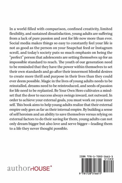 In a world filled with comparison, confined creativity, limited flexibility, and sustained dissatisfaction, young adults are suffering from a lack of pure passion and zest for life now more than ever. Social media makes things so easy to constantly feel your life is not as good as the person on your Snapchat feed or Instagram scroll, and today's society puts so much emphasis on being the "perfect" person that adolescents are setting themselves up for an impossible standard to reach. The youth of our generation needs to be reminded that they have the power within themselves to set their own standards and go after their innermost blissful desires to create more thrill and purpose in their lives than they could ever deem possible. Magic in the lives of young adults needs to be reinstalled, dreams need to be reintroduced, and seeds of passion for life needs to be replanted. Be Your Own Hero cultivates a mind-set that the door to success always swings inward, not outward. In order to achieve your external goals, you must work on your inner self. This book aims to help young adults realize that their external empire only goes as far as their internal empire. By building a sense of self heroism and an ability to save themselves versus relying on external factors to do their saving for them, young adults can not only dream bigger but also love and serve bigger-leading them to a life they never thought possible.