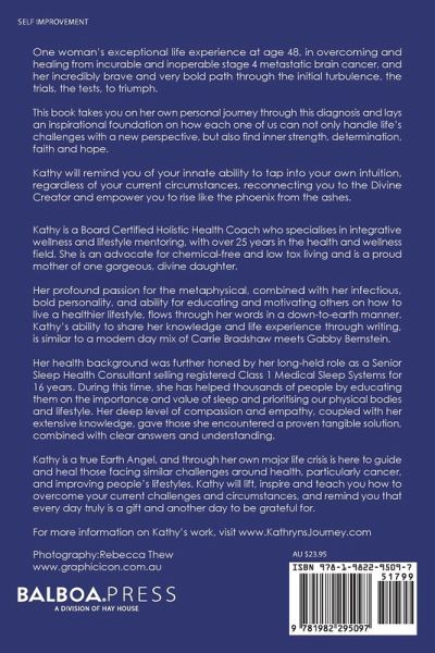 One woman's exceptional life experience at age 48, in overcoming and healing from incurable and inoperable stage 4 metastatic brain cancer, and her incredibly brave and very bold path through the initial turbulence, the trials, the tests, to triumph. This book takes you on her own personal journey through this diagnosis and lays an inspirational foundation on how each one of us can not only handle life's challenges with a new perspective, but also find inner strength, determination, faith and hope. Kathy will remind you of your innate ability to tap into your own intuition, regardless of your current circumstances, reconnecting you to the Divine Creator and empower you to rise like the phoenix from the ashes.