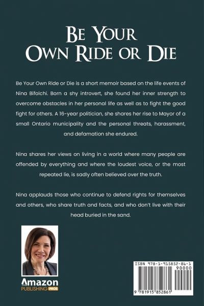 Be Your Own Ride or Die is a short memoir based on the life events of Nina Bifolchi. Born a shy introvert, she found her inner strength to overcome obstacles in her personal life as well as to fight the good fight for others. A 16-year politician, she shares her rise to Mayor of a small Ontario municipality and the personal threats, harassment, and defamation she endured. Nina shares her views on living in a world where many people are offended by everything and where the loudest voice, or the most repeated lie, is sadly often believed over the truth. Nina applauds those who continue to defend rights for themselves and others, who share truth and facts, and who don't live with their head buried in the sand.