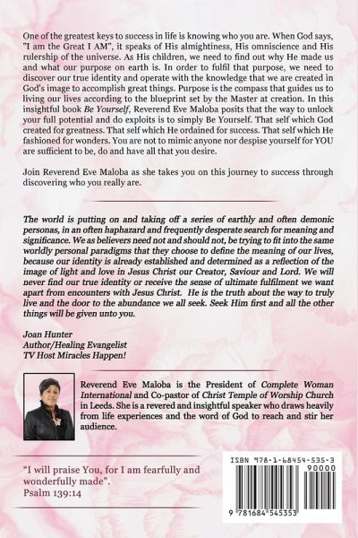 One of the greatest keys to success in life is knowing who you are. When God says, "I am the Great I AM", it speaks of His almightiness, His omniscience and His rulership of the universe. As His children, we need to find out why He made us and what our purpose on earth is. In order to fulfil that purpose, we need to discover our true identity and operate with the knowledge that we are created in God's image to accomplish great things. God's word says in John 14:12, "Very truly I tell you, whoever believes in me will do the works I have been doing, and they will do even greater things than these". Purpose is the compass that guides us to living our lives according to the blueprint set by the Master at creation. In this insightful book Be Yourself, Reverend Eve Maloba posits that the way to unlock your full potential and do exploits is to simply Be Yourself. That self which God created for greatness. That self which He ordained for success. That self which He fashioned for wonders. You are not to mimic anyone nor despise yourself for YOU are sufficient to be, do and have all that you desire. Join Reverend Eve Maloba as she takes you on this journey to success through discovering who you really are.