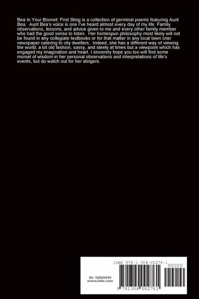 Bea In Your Bonnet: First Sting is a collection of germinal poems featuring Aunt Bea. Aunt Bea's voice is one I've heard almost every day of my life. Family observations, lessons, and advice given to me and every other family member who had the good sense to listen. Her homespun philosophy most likely will not be found in any collegiate textbooks or for that matter in any local town crier newspaper catering to city dwellers. Indeed, she has a different way of viewing the world; a bit old fashion, sassy, and steely at times but a viewpoint which has engaged my imagination and heart. I sincerely hope you too will find some morsel of wisdom in her personal observations and interpretations of life's events, but do watch out for her stingers.