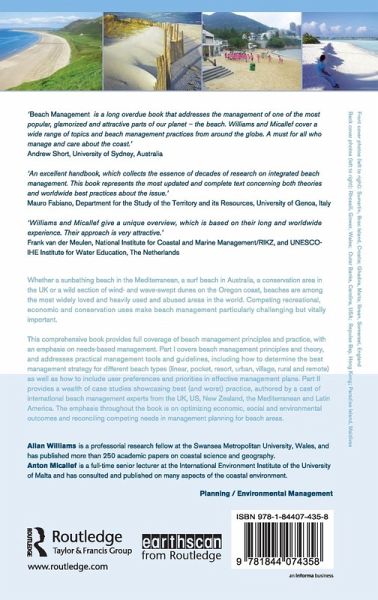 This comprehensive book provides full coverage of beach management principles and practice, with an emphasis on needs-based management. The book provides a wealth of case studies from the UK, USA, New Zealand, the Mediterranean, and Latin America. The emphasis throughout the book is on optimizing economic, social and environmental outcomes and reconciling competing needs in management planning for beach area. This book is an indispensable tool kit for all professionals in beach and coastal/beach zone management . It is also a comprehensive primer for university undergraduate students in professional planning, land management, coastal geography as well as tourism and conservation planning and management.