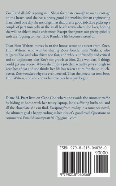 Zoe Randall's life is going well. She is fortunate enough to own a cottage on the beach, and she has a pretty good job working for an engineering firm. Until one day she no longer has that pretty good job. Zoe picks up a couple of part time jobs in the small beach town where she lives, hoping she will be able to make ends meet. Except she figures out pretty quickly ends aren't going to meet. Zoe Randall's life becomes stressful. And then Finn Walters moves in to the house across the street from Zoe's. Finn Walters, who will be sharing Zoe's beach. Finn Walters, who tailgates Zoe and who drives too fast, and who is unfriendly and critical and so unpleasant that Zoe's cat growls at him. Zoe wonders if things could get any worse. When she finds a job that actually pays enough to keep her afloat and she thinks her life has taken a turn for the so-much-better, Zoe wonders why she ever worried. Then she meets her new boss, Finn Walters, and she knows her troubles have just begun.