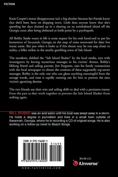 Katie Cooper's recent disappearance isn't a big shocker because her friends know that she'd been bent on skipping town. Little does anyone know that she's spending her days chained up in a clearing on an uninhabited island off the Georgia coast after being abducted at knife-point by a psychopath. All Bobby Steele wants in life is some respect for his rock band-and to put his hometown of Savannah, Georgia on the map of cities renowned for their live music scene. But just when it looks as if this dream may be one step closer to reality, a killer strikes in the nearby gambling town of Salt Island. The murderer, dubbed the "Salt Island Slasher" by the local media, toys with investigators by leaving mysterious messages in his victims' throats. Bobby's lifelong friend and sailing partner, Jim Ferguson, uses his family connections with the local newspaper to obtain the contents of these supposedly top-secret messages. Bobby is the only one who can glean anything meaningful from the strange words, and time is rapidly running out for him to prevent the next victim's agonizing demise. The two friends use their wits and sailing skills to deal with a persistent enemy from the past as they work together to prevent the Salt Island Slasher from striking again.