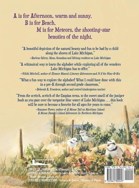Spending time outdoors enriches children's creativity, imaginations, and relaxes and refreshes them. With the use of beautiful watercolor illustrations, Beaches, Boats, and Birds: A Lake Michigan Alphabet Book, examines the importance of playing outside with family while also teaching children to appreciate and respect nature and beauty. This book shares a story of the Great Lakes beaches for first-time visitors or for those who want to relive their experience, while also serving as inspiration and motivation to unplug and get away from technology and screens. Beaches, Boats, and Birds: A Lake Michigan Alphabet Book will serve as a keepsake for those vacationing to the Great Lakes, and for those who cannot visit, it will serve as an educational tool, showcasing the uniqueness of the treasures our state holds.