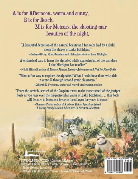 Spending time outdoors enriches children's creativity, imaginations, and relaxes and refreshes them. With the use of beautiful watercolor illustrations, Beaches, Boats, and Birds: A Lake Michigan Alphabet Book, examines the importance of playing outside with family while also teaching children to appreciate and respect nature and beauty. This book shares a story of the Great Lakes beaches for first-time visitors or for those who want to relive their experience, while also serving as inspiration and motivation to unplug and get away from technology and screens. Beaches, Boats, and Birds: A Lake Michigan Alphabet Book will serve as a keepsake for those vacationing to the Great Lakes, and for those who cannot visit, it will serve as an educational tool, showcasing the uniqueness of the treasures our state holds.