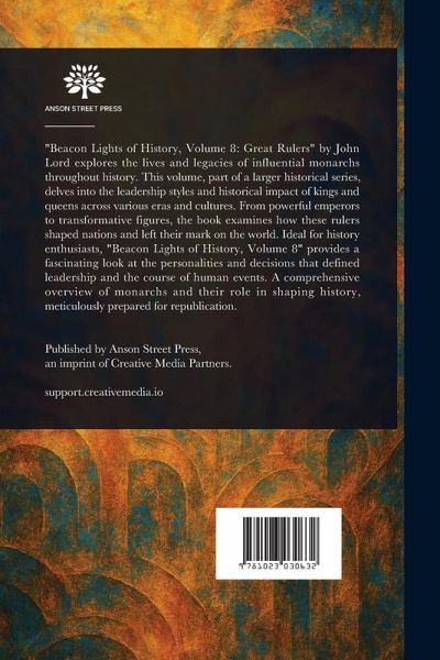 "Beacon Lights of History, Volume 8: Great Rulers" by John Lord explores the lives and legacies of influential monarchs throughout history. This volume, part of a larger historical series, delves into the leadership styles and historical impact of kings and queens across various eras and cultures. From powerful emperors to transformative figures, the book examines how these rulers shaped nations and left their mark on the world. Ideal for history enthusiasts, "Beacon Lights of History, Volume 8" provides a fascinating look at the personalities and decisions that defined leadership and the course of human events. A comprehensive overview of monarchs and their role in shaping history, meticulously prepared for republication. This work has been selected by scholars as being culturally important, and is part of the knowledge base of civilization as we know it. This work is in the public domain in the United States of America, and possibly other nations. Within the United States, you may freely copy and distribute this work, as no entity (individual or corporate) has a copyright on the body of the work. Scholars believe, and we concur, that this work is important enough to be preserved, reproduced, and made generally available to the public. We appreciate your support of the preservation process, and thank you for being an important part of keeping this knowledge alive and relevant.