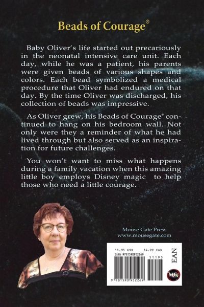Beads of Courage® Oliver's Story by Rosanna Gartley Baby Oliver's life started out precariously in the neonatal intensive care unit. Each day, while he was a patient, his parents were given beads of various shapes and colors. Each bead symbolized a medical procedure that Oliver had endured on that day. By the time Oliver was discharged, his collection of beads was impressive. As Oliver grew, his Beads of Courage® continued to hang on his bedroom wall. Not only were they a reminder of what he had lived through but also served as an inspiration for future challenges. You won't want to miss what happens during a family vacation when this amazing little boy employs Disney magic to help those who need a little courage.
