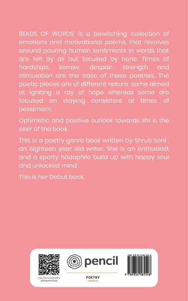 BEADS OF WORDS' is a bewitching collection of emotions and motivational poems, that revolves around pouring human sentiments in words that are felt by all but focused by none. Times of hardships, sorrow, despair, strength and stimulation are the base of these poetries. The poetic pieces are of different nature, some aimed at igniting a ray of hope whereas some are focused on staying consistent at times of pessimism. Optimistic and positive outlook towards life is the elixir of the book. This is a poetry genre book written by Shruti Soni , an eighteen year old writer. She is an enthusiast and a sporty hodophile build up with happy soul and unlocked mind . This is her Debut book.