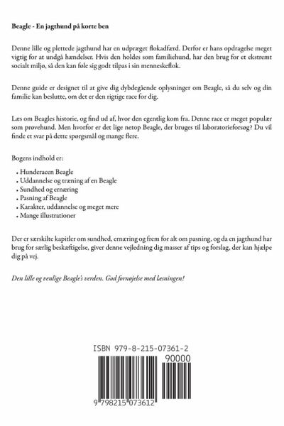 Beagle - En jagthund på korte ben Denne lille og plettede jagthund har en udpræget flokadfærd. Derfor er hans opdragelse meget vigtig for at undgå hændelser. Hvis den holdes som familiehund, har den brug for et ekstremt socialt miljø, så den kan føle sig godt tilpas i sin menneskeflok. Denne guide er designet til at give dig dybdegående oplysninger om Beagle, så du selv og din familie kan beslutte, om det er den rigtige race for dig. Læs om Beagles historie, og find ud af, hvor den egentlig kom fra. Denne race er meget populær som prøvehund. Men hvorfor er det lige netop Beagle, der bruges til laboratorieforsøg? Du vil finde et svar på dette spørgsmål og mange flere. Bogens indhold er:Hunderacen Beagle Uddannelse og træning af en Beagle Sundhed og ernæring Pasning af Beagle Karakter, uddannelse og meget mere Mange illustrationer Der er særskilte kapitler om sundhed, ernæring og frem for alt om pasning, og da en jagthund har brug for særlig beskæftigelse, giver denne vejledning dig masser af tips og forslag, der kan hjælpe dig på vej. Den lille og venlige Beagle's verden. God fornøjelse med læsningen!