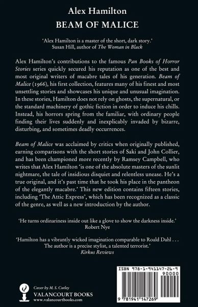 'Alex Hamilton is one of the absolute masters of the sunlit nightmare, the tale of insidious disquiet and relentless unease. He's a true original, and it's past time that he took his place in the pantheon of the elegantly macabre.' - Ramsey Campbell 'Hamilton has a vibrantly wicked imagination comparable to Roald Dahl ... The author is a precise stylist, a talented terrorist.' - Kirkus Reviews 'He turns ordinariness inside out like a glove to show the darkness inside.' - Robert Nye 'A Saki-like atmosphere and effect in which the strange is suddenly interjected into the real as if it were really there all the time waiting to be discovered.' - Choice Alex Hamilton's contributions to the famous Pan Books of Horror Stories series quickly secured his reputation as one of the best and most original writers of macabre tales of his generation. Beam of Malice (1966), his first collection, features many of his finest and most unsettling tales and showcases his unique and unusual imagination. In these stories, Hamilton does not rely on ghosts, the supernatural, or the standard machinery of horror fiction in order to induce his chills. Instead, he focuses on ordinary people whose lives are suddenly and inexplicably interrupted by bizarre, disturbing, and sometimes deadly occurrences. Beam of Malice was acclaimed by critics when originally published, earning comparisons with the short stories of Saki and John Collier, and has been championed more recently by Ramsey Campbell, who writes, 'Alex Hamilton is one of the absolute masters of the sunlit nightmare, the tale of insidious disquiet and relentless unease. He's a true original, and it's past time that he took his place in the pantheon of the elegantly macabre.' This new edition includes fifteen stories, including 'The Attic Express', which has been recognized as a classic of the genre, as well as a new introduction by the author.