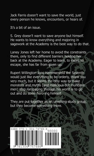 Jack Farris doesn't want to save the world, just every person he knows, encounters, or hears of. It's a bit of an issue. S. Grey doesn't want to save anyone but himself. He wants to know everything and majoring in sagework at the Academy is the best way to do that. Laney Jones left her home to avoid the constraints there, only to find different barriers holding her back at the Academy. Eager to learn, to excel, to escape, she has far from given up. Rupert Willington Jons Hammersfeld the Seventh would just like everything to be orderly, thank you very much, but it seems the only way to make monsters and myths (and malicious but mundane men) stop rampaging through his world is to go out and do some hero-ing himself. They are put together as an unwilling study group, but they become something more.