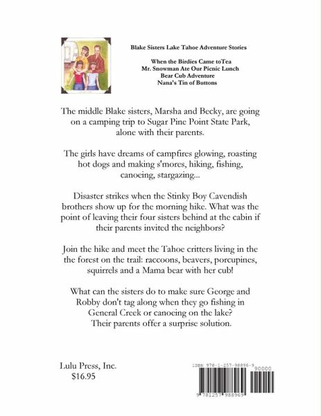 The middle Blake sisters, Marsha and Becky, are going on a camping trip to Sugar Pine Point State Park, alone with their parents. The girls have dreams of campfires glowing, roasting hot dogs and making s'mores, hiking, fishing, canoeing, stargazing... Disaster strikes when the Stinky Boy Cavendish brothers show up for the morning hike. What was the point of leaving their four sisters behind at the cabin if their parents invited the neighbors? Join the hike and meet the Tahoe critters living in the the forest on the trail: raccoons, beavers, porcupines, squirrels and a Mama bear with her cub! What can the sisters do to make sure George and Robby don't tag along when they go fishing in General Creek or canoeing on the lake? A wise owl hoots answers from a tree above the girls' tent at night and their parents offer a surprise solution.