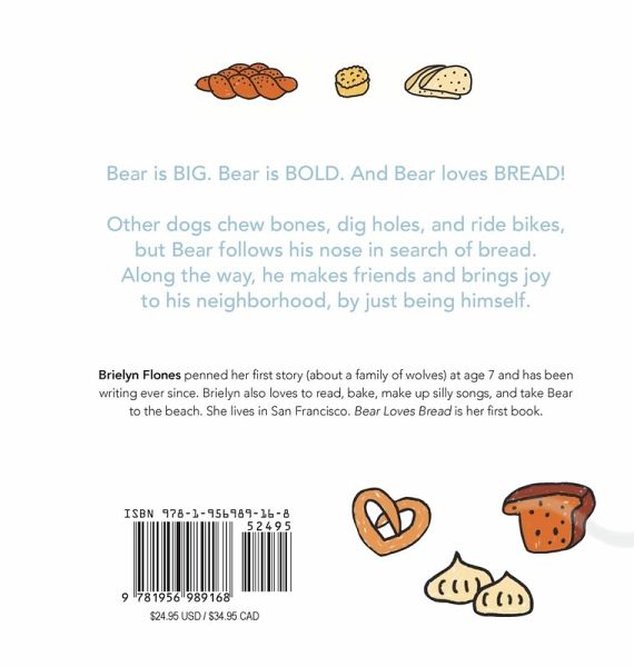 Brielyn Flones penned her first story (about a family of wolves) at age 7 and has been writing ever since. Brielyn also loves to read, bake, make up silly songs, and take Bear to the beach. She lives in San Francisco. Bear Loves Bread is her first book.