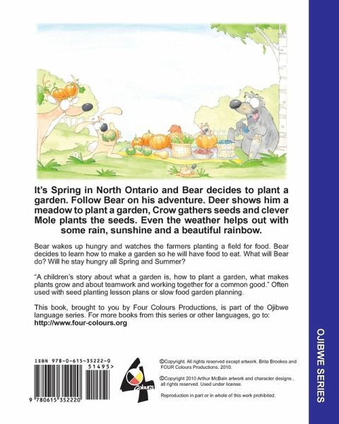 It’s Spring in North Ontario and Bear decides to plant a garden. Follow Bear on his adventure. Deer shows him a meadow to plant a garden, Crow gathers seeds and clever Mole plants the seeds. Even the weather helps out with some rain, sunshine and a beautiful rainbow. Bear wakes up hungry and watches the farmers planting a field for food. Bear decides to learn how to make a garden so he will have food to eat. What will Bear do? Will he stay hungry all Spring and Summer? "A children’s story about what a garden is, how to plant a garden, what makes plants grow and about teamwork and working together for a common good." Often used with seed planting lesson plans or slow food garden planning. This book, brought to you by Four Colours Productions, is part of the Ojibwe language series. For more books from this series or other languages, please go to: www.four-colours.org