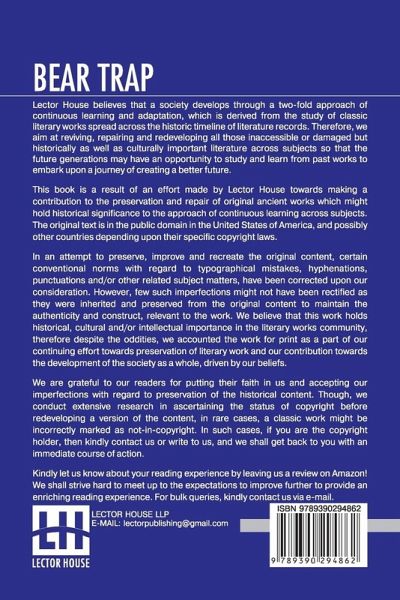 Bear Trap This book is a result of an effort made by us towards making a contribution to the preservation and repair of original classic literature. In an attempt to preserve, improve and recreate the original content, we have worked towards: 1. Type-setting & Reformatting: The complete work has been re-designed via professional layout, formatting and type-setting tools to re-create the same edition with rich typography, graphics, high quality images, and table elements, giving our readers the feel of holding a 'fresh and newly' reprinted and/or revised edition, as opposed to other scanned & printed (Optical Character Recognition - OCR) reproductions. 2. Correction of imperfections: As the work was re-created from the scratch, therefore, it was vetted to rectify certain conventional norms with regard to typographical mistakes, hyphenations, punctuations, blurred images, missing content/pages, and/or other related subject matters, upon our consideration. Every attempt was made to rectify the imperfections related to omitted constructs in the original edition via other references. However, a few of such imperfections which could not be rectified due to intentional\unintentional omission of content in the original edition, were inherited and preserved from the original work to maintain the authenticity and construct, relevant to the work. We believe that this work holds historical, cultural and/or intellectual importance in the literary works community, therefore despite the oddities, we accounted the work for print as a part of our continuing effort towards preservation of literary work and our contribution towards the development of the society as a whole, driven by our beliefs. We are grateful to our readers for putting their faith in us and accepting our imperfections with regard to preservation of the historical content. HAPPY READING!