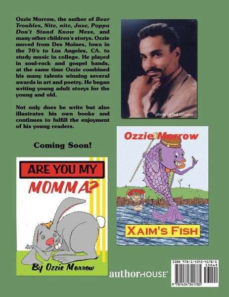 Ozzie Morrow, the author of Bear Troubles, Nite, nite, Jase, Poppa Don't Stand Know Mess, and many other children's storys. Ozzie moved from Des Moines, Iowa in the 70's to Los Angeles, CA. to study music in college. He played in soul-rock and gospel bands, at the same time Ozzie combined his many talents winning several awards in art and poetry. He began writing young adult storys for the young and old. Not only does he write but also illustrates his own books and continues to fulfill the enjoyment of his young readers. Coming Soon!