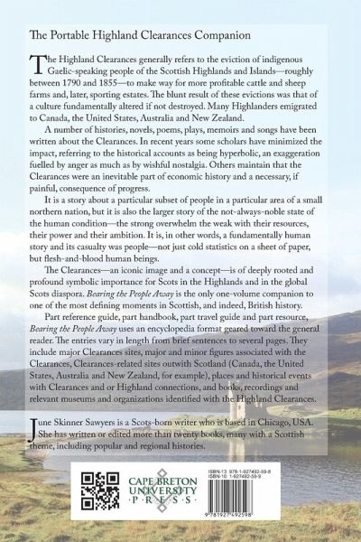 Part reference guide, part handbook, part travel guide and part resource in one portable volume, Bearing the People Away uses an encyclopedia format geared toward the general reader. The entries vary in length from brief sentences to several paragraphs. They include major Clearance sites, major and minor figures associated with the Clearances, Clearance-related sites outwith Scotland (significant parts of the Scottish Diaspora as Canada, the United States, Australia and New Zealand), places and historical events with Clearance and or Highland connections, and recordings, websites and relevant museums and organizations identified with the Highland Clearances. June Skinner Sawyers is a Scots-born writer who is based in Chicago, USA. She has written or edited more than twenty books, many with a Scottish theme, including popular and regional histories.