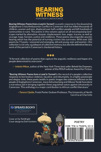 Bearing Witness: Poems from a Land in Turmoil is a poetic response to the devastating Anglophone Crisis/Ambazonian Conflict in Cameroon that has killed thousands of children, women and men, displaced over half a million people and left hundreds of communities in ruins. The poems in this volume capture an all-encompassing landscape marked by alienation, despair, displacement, loss, anger, trauma, as well as courage, hope, heroism, justice and resilience. These poems also engender psychic healing which has the potential of turning victims into survivors. With over 100 poems by 73 poets—seasoned and emerging, old and young, men and women—this collection is not only a guidepost of collective memory, but also the definitive literary work of this period in Cameroon’s checkered history.