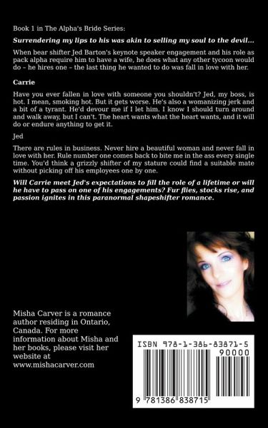 Book 1 in The Alpha's Bride Series: Surrendering my lips to his was akin to selling my soul to the devil... When bear shifter Jed Barton's keynote speaker engagement and his role as pack alpha require him to have a wife, he does what any other tycoon would do – he hires one – the last thing he wanted to do was fall in love with her. Carrie Have you ever fallen in love with someone you shouldn't? Jed, my boss, is hot. I mean, smoking hot. But it gets worse. He's also a womanizing jerk and a bit of a tyrant. He'd devour me if I let him. I know I should turn around and walk away, but I can't. The heart wants what the heart wants, and it will do or endure anything to get it. Jed There are rules in business. Never hire a beautiful woman and never fall in love with her. Rule number one comes back to bite me in the ass every single time. You'd think a grizzly shifter of my stature could find a suitable mate without picking off his employees one by one. Will Carrie meet Jed's expectations to fill the role of a lifetime or will he have to pass on one of his engagements? Fur flies, stocks rise, and passion ignites in this paranormal shapeshifter romance. More from Misha: BILLIONAIRE SEEKS AN HEIR Unplanned Fairy Tale Unraveled Lives Unforgettable Melody BIG CITY HEAT: Light My Fire I'm On Fire Ring of Fire PURRFECT MATES: Purrfect Chaos Purrfect Storm Purrfect Harmony About the Author: Misha Carver loves writing sensual paranormal/shifter and new adult/contemporary romance stories for people who want to escape into another world. Whether you're looking for shifter tales or hot alpha males, Misha's your girl. Why not put her on your eReader today?