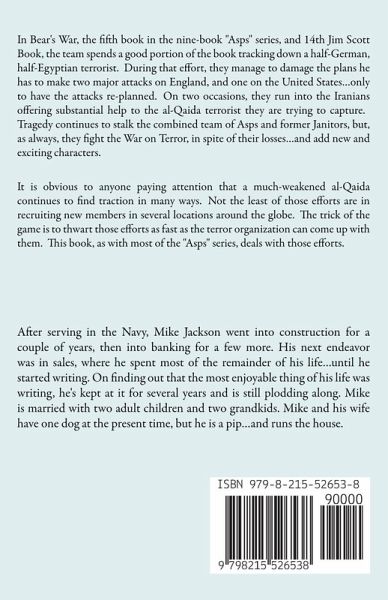 In Bear's War, the fifth book in the nine-book "Asps" series, and 14th Jim Scott Book, the team spends a good portion of the book tracking down a half-German, half-Egyptian terrorist. During that effort, they manage to damage the plans he has to make two major attacks on England, and one on the United States…only to have the attacks re-planned. On two occasions, they run into the Iranians offering substantial help to the al-Qaida terrorist they are trying to capture. Tragedy continues to stalk the combined team of Asps and former Janitors, but, as always, they fight the War on Terror, in spite of their losses…and add new and exciting characters. It is obvious to anyone paying attention that a much-weakened al-Qaida continues to find traction in many ways. Not the least of those efforts are in recruiting new members in several locations around the globe. The trick of the game is to thwart those efforts as fast as the terror organization can come up with them. This book, as with most of the "Asps" series, deals with those efforts.