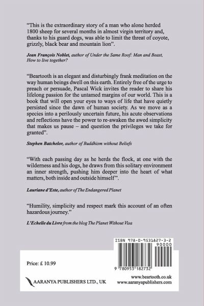 BEARTOOTH Diary of a Nomadic Herder By Pascal Wick Beginning in the French Alps, ending in the Alpujarras, Spain, the major part of the Diary is written in the Absaroka Beartooth Wilderness, Montana, USA. It is the extraordinary story of a man who alone herded1800 sheep for several months in almost virgin territory and, thanks to his guard dogs, was able to limit the threat of coyote, black bear, grizzly and mountain lion . A book that will open your eyes to ways of life that have quietly persisted since the dawn of human society.
