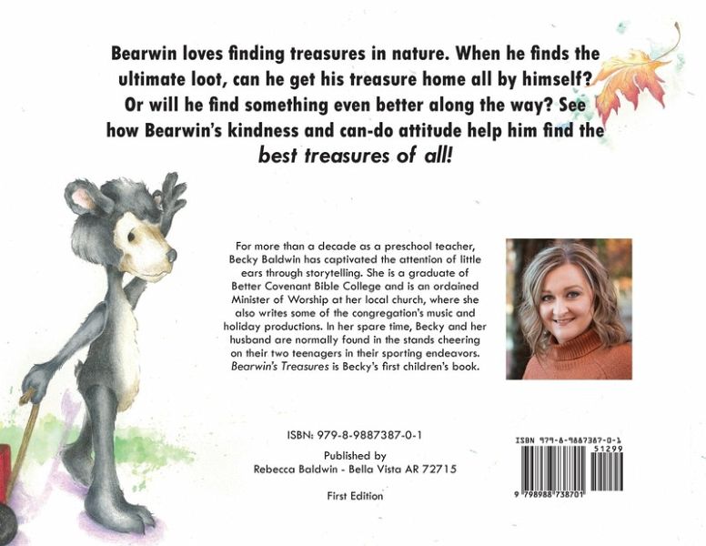 For more than a decade as a preschool teacher, Becky Baldwin has captivated the attention of little ears through storytelling. She is an ordained Minister of Worship at her local church, for which she also writes songs and holiday productions. Becky, her husband, and their two children call the rolling hills of Northwest Arkansas home. Bearwin's Treasures is Becky's first children's book.