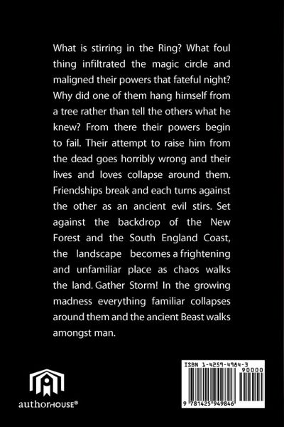 What is stirring in the Ring? What foul thing infiltrated the magic circle and maligned their powers that fateful night? Why did one of them hang himself from a tree rather than tell the others what he knew? From there their powers begin to fail. Their attempt to raise him from the dead goes horribly wrong and their lives and loves collapse around them. Friendships break and each turns against the other as an ancient evil stirs. Set against the backdrop of the New Forest and the South England Coast, the landscape becomes a frightening and unfamiliar place as chaos walks the land. Gather Storm! In the growing madness everything familiar collapses around them and the ancient Beast walks amongst man.