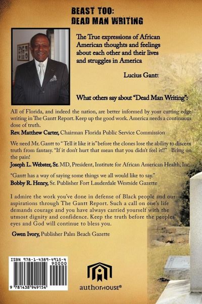 Beast Too: Dead Man Writing is the most recent compilation of columns written by America's most prolific Black newspaper journalist, Lucius Gantt! This book is a must have for anyone desiring to know the truth about African-American feelings about life, politics, economics, religion and relationships. Lucius Gantt is a world class writer, once employed by The Associated Press, The Washington Post, The Atlanta Journal and National Public Radio. His column The Gantt Report appears in America's major Black-owned newspapers and information internet web sites. Joseph L. Webster, Sr. MD, President, Institute for African American Health, Inc. Says, "The Gantt Report, like its founder, has been a breath of fresh air for the community - especially the Black Community. "Truth" has been so distorted by the mainstream media that an entire world of "clones" move about daily in a fantasy land in which they are the puppets of big money. We NEED the GANTT REPORT and Mr. Gantt to " Tell it like it is" before the clones lose the ability to discern truth from fantasy. Congratulations on the release of your latest literary contribution to the sanity of humankind. "If it don't hurt that mean that you didn't feel it!!" Bring on the pain!"