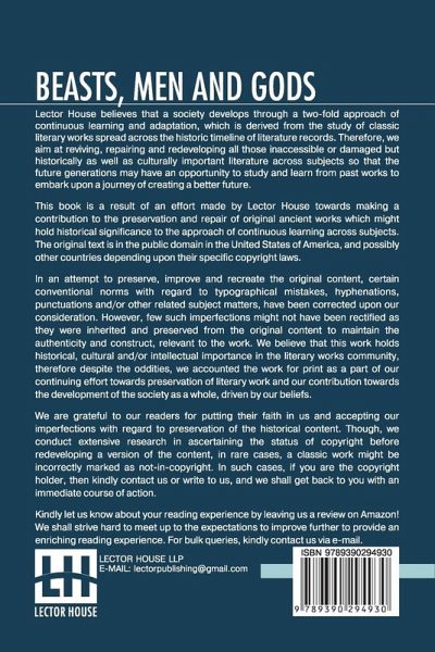 Beasts, Men And Gods: Translated By Lewis Stanton Palen This book is a result of an effort made by us towards making a contribution to the preservation and repair of original classic literature. In an attempt to preserve, improve and recreate the original content, we have worked towards: 1. Type-setting & Reformatting: The complete work has been re-designed via professional layout, formatting and type-setting tools to re-create the same edition with rich typography, graphics, high quality images, and table elements, giving our readers the feel of holding a 'fresh and newly' reprinted and/or revised edition, as opposed to other scanned & printed (Optical Character Recognition - OCR) reproductions. 2. Correction of imperfections: As the work was re-created from the scratch, therefore, it was vetted to rectify certain conventional norms with regard to typographical mistakes, hyphenations, punctuations, blurred images, missing content/pages, and/or other related subject matters, upon our consideration. Every attempt was made to rectify the imperfections related to omitted constructs in the original edition via other references. However, a few of such imperfections which could not be rectified due to intentional\unintentional omission of content in the original edition, were inherited and preserved from the original work to maintain the authenticity and construct, relevant to the work. We believe that this work holds historical, cultural and/or intellectual importance in the literary works community, therefore despite the oddities, we accounted the work for print as a part of our continuing effort towards preservation of literary work and our contribution towards the development of the society as a whole, driven by our beliefs. We are grateful to our readers for putting their faith in us and accepting our imperfections with regard to preservation of the historical content. HAPPY READING!