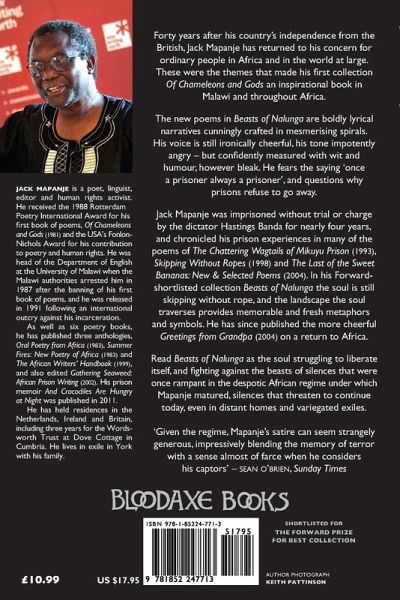 Jack Mapanje is a poet, linguist, editor and human rights activist. He received the 1988 Rotterdam Poetry International Award for his first book of poems, Chameleons and Gods (1981) and the USA's Fonlon-Nichols Award for his contribution to poetry and human rights. His latest collection, Beasts of Nalunga (Bloodaxe Books, 2007), was shortlisted for the Forward Prize for Best Collection. Jack Mapanje was head of the Department of English at the University of Malawi when the Malawi authorities arrested him in 1987 after his first book of poems had been banned, and he was released in 1991 after spending three years, seven months and sixteen days in prison, following an international outcry against his incarceration. He has since published four poetry books, The Chattering Wagtails of Mikuyu Prison (1993), Skipping Without Ropes (Bloodaxe, 1998), The Last of the Sweet Bananas: New & Selected Poems (Bloodaxe, 2004) and Beasts of Nalunga (Bloodaxe, 2007), as well as three anthologies, Oral Poetry from Africa (1983), Summer Fires: New Poetry of Africa (1983) and The African Writers' Handbook (1999); and he edited the acclaimed Gathering Seaweed: African Prison Writing (2002). His latest book is his prison memoir And Crocodiles Are Hungry at Night (Ayebia Clarke Publishing, 2011). Mapanje has held residences in the Netherlands, the Republic of Ireland and throughout Britain, including two years with the Wordsworth Trust at Dove Cottage in Cumbria. He lives in exile in York with his family, and is currently a visiting professor in the faculty of art at York St John University. He was awarded an honorary doctorate by the University of Bedfordshire in 2015.