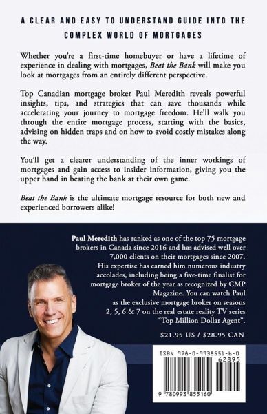 Originally released in 2017, this new 3rd edition of Beat the Bank has been completely updated for 2025! Top Canadian mortgage broker Paul Meredith provides powerful information that your bank or broker may not be telling you. This is information that could end up costing you thousands if you aren't aware of it. Whether you are a first time homebuyer or have a lifetime of experience in dealing with mortgages, Beat the Bank will make you look at mortgages from an entirely different perspective. You will become armed with knowledge and insight that will make you aware of hidden mortgage traps that so many unsuspecting homebuyers can fall into. Get clearer understanding of what to watch out for and which questions to ask your mortgage professional to feel rest assured you're being looked after in the best way possible. Beat the Bank is the ultimate mortgage resource for both new and experienced borrowers alike!
