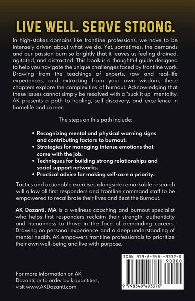 Live Well. Serve Strong. In high-stakes domains like frontline professions, we have to be intensely driven about what we do. Yet, sometimes, the demands and our passion burn so brightly that it leaves us feeling drained, agitated, and distracted. This book is a thoughtful guide designed to help you navigate the unique challenges faced by frontline work. Drawing from the teachings of experts, raw and real-life experiences, and extracting from your own wisdom, these chapters explore the complexities of burnout. Acknowledging that these issues cannot simply be resolved with a "suck it up" mentality, AK presents a path to healing, self-discovery, and excellence in homelife and career. The steps on this path include: * Recognizing mental and physical warning signs and contributing factors to burnout. * Strategies for managing intense emotions that come with the job. * Techniques for building strong relationships and social support networks. * Practical advice for making self-care a priority Practical tactics and actionable exercises, alongside remarkable research, will allow all first responders and frontline command staff to be empowered to recalibrate their lives and Beat the Burnout.