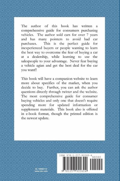 This is an comprehensive guide to buying a vehicle. The objectives of this guide is to assist consumers in finding the right vehicle for the right price, avoiding bad decisions, and increasing confidence with the car-buying process. Learn about products, negotiations, how to handle the various processes to buying a vehicle. The author sold cars for over 7 years and offers advice to handle the process without fear. Be confident and save money. This book comes with updates via blog and twitter, you can actually ask questions directly to the author. Let my experience help you for a very small cost!!