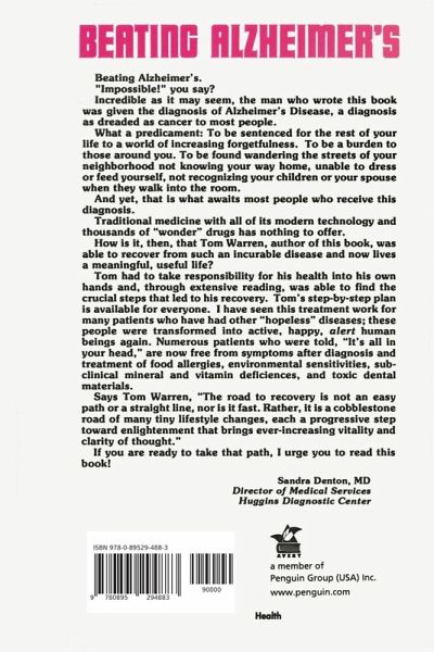 Beating Alzheimer's is considered by many to be impossible. But incredible as it may seem, the man who wrote this book was given the diagnosis of Alzheimer's disease, a diagnosis as dreaded as cancer to most people, and reversed his devastating symptoms. Traditional medicine, with all of its modern technology and thousands of "wonder" drugs, has failed to solve the most tragic illness, one which causes you to be sentenced for the rest of your life to a world of increasing forgetfulness, and to become a burden to those around you, unable to dress or feed yourself, not recognizing your children or your spouse when they walk into the room. How is it, then, that Tom Warren was able to recover from such an incurable disease and now lives a meaningful, useful life? Tom had to take responsibility for his health into his own hands and, through extensive reading, was able to find the crucial steps that led to his recovery. Now his step-by-step plan is available for everyone.