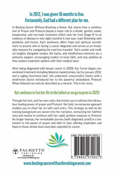 Find hope and inspiration in a breast cancer survivor's miraculous recovery and discover how an alternative treatment approach literally saved her life... in just 8 short months! Diagnosed with stage IV breast cancer, Kat Turner was given eighteen months to live - but God had another plan. After starting an alternative treatment, she went from planning her funeral to planning her future. Beginning with the discovery of this recurrence in 2012, Kat started keeping a diary and, as days turned to weeks and weeks turned to months and months turned to years, her journaling grew into something much bigger. While in the bargaining stage of grief over her diagnosis, Kat made a promise to God and her diary/turned memoir is a fulfillment of that promise. In Beating Cancer Without Breaking a Sweat, Kat shares how a combination of prayer and Protocel played a major role in a kinder, gentler, easier, inexpensive, and non-toxic treatment which took her from Stage IV to no evidence of disease in only eight months. A fast, easy read, brimming with positivity and humor, Kat's testimony offers hope and spiritual nourishment to anyone who has, or has a loved one who has, been recently diagnosed with cancer and serves an invaluable resource for navigating the road less traveled. Kat's candor and medical insights alongside recipes, life hacks, and mindfulness moments are a welcome support, encouraging readers to have faith and stay positive as they explore treatment options with their medical team. This is her story.