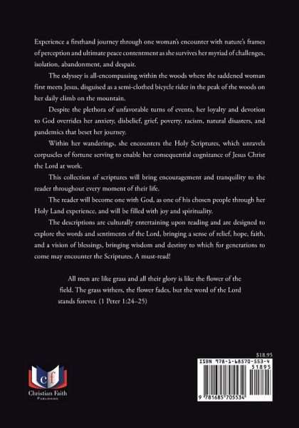 Experience a firsthand journey through one woman's encounter with nature's frames of perception and ultimate peace contentment as she survives her myriad of challenges, isolation, abandonment, and despair. The odyssey is all-encompassing within the woods where the saddened woman first meets Jesus, disguised as a semi-clothed bicycle rider in the peak of the woods on her daily climb on the mountain. Despite the plethora of unfavorable turns of events, her loyalty and devotion to God overrides her anxiety, disbelief, grief, poverty, racism, natural disasters, and pandemics that beset her journey. Within her wanderings, she encounters the Holy Scriptures, which unravels corpuscles of fortune serving to enable her consequential cognizance of Jesus Christ the Lord at work. This collection of scriptures will bring encouragement and tranquility to the reader throughout every moment of their life. The reader will become one with God, as one of his chosen people through her Holy Land experience, and will be filled with joy and spirituality. The descriptions are culturally entertaining upon reading and are designed to explore the words and sentiments of the Lord, bringing a sense of relief, hope, faith, and a vision of blessings, bringing wisdom and destiny to which for generations to come may encounter the Scriptures. A must-read! All men are like grass and all their glory is like the flower of the field. The grass withers, the flower fades, but the word of the Lord stands forever. (1 Peter 1:24-25)