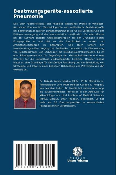 Das Buch "Bacteriological and Antibiotic Resistance Profile of Ventilator-Associated Pneumonia" (Bakteriologische und antibiotische Resistenzprofile bei beatmungsassoziierter Lungenentzündung) ist für die Verbesserung der Patientenversorgung auf der Intensivstation unerlässlich. Es leitet Kliniker bei der Auswahl gezielter Antibiotikatherapien auf der Grundlage lokaler Erregerprofile an und hilft so, die Sterblichkeit zu senken und Antibiotikaresistenzen zu bekämpfen. Das Buch fördert den verantwortungsvollen Umgang mit Antibiotika, unterstützt die Überwachung von Resistenztrends und verbessert die Infektionskontrollprotokolle. Es ist eine Bildungsressource für Angehörige der Gesundheitsberufe und eine Referenz für die Entwicklung evidenzbasierter Leitlinien. Darüber hinaus bietet es eine Grundlage für die künftige Forschung und die Entwicklung von Strategien und trägt zu einer besseren Behandlung und Prävention von VAP weltweit bei.