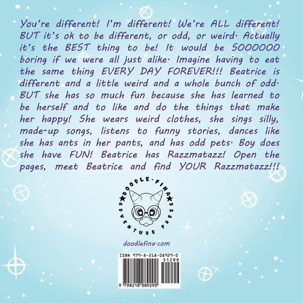 You're different! I'm different! We're ALL different! BUT it's ok to be different, or odd, or weird. Actually it's the BEST thing to be! It would be SOOOOOO boring if we were all just alike. Imagine having to eat the same thing EVERY DAY FOREVER!!! Beatrice is different and a little weird and a whole bunch of odd. BUT she has so much fun because she has learned to be herself and to like and do the things that make her happy! She wears weird clothes, she sings silly, made-up songs, listens to funny stories, dances like she has ants in her pants, and has odd pets. Boy does she have FUN! Beatrice has Razzmatazz! Open the pages, meet Beatrice and find YOUR Razzmatazz!!!
