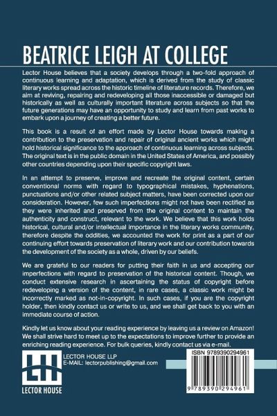 Beatrice Leigh At College: A Story For Girls This book is a result of an effort made by us towards making a contribution to the preservation and repair of original classic literature. In an attempt to preserve, improve and recreate the original content, we have worked towards: 1. Type-setting & Reformatting: The complete work has been re-designed via professional layout, formatting and type-setting tools to re-create the same edition with rich typography, graphics, high quality images, and table elements, giving our readers the feel of holding a 'fresh and newly' reprinted and/or revised edition, as opposed to other scanned & printed (Optical Character Recognition - OCR) reproductions. 2. Correction of imperfections: As the work was re-created from the scratch, therefore, it was vetted to rectify certain conventional norms with regard to typographical mistakes, hyphenations, punctuations, blurred images, missing content/pages, and/or other related subject matters, upon our consideration. Every attempt was made to rectify the imperfections related to omitted constructs in the original edition via other references. However, a few of such imperfections which could not be rectified due to intentional\unintentional omission of content in the original edition, were inherited and preserved from the original work to maintain the authenticity and construct, relevant to the work. We believe that this work holds historical, cultural and/or intellectual importance in the literary works community, therefore despite the oddities, we accounted the work for print as a part of our continuing effort towards preservation of literary work and our contribution towards the development of the society as a whole, driven by our beliefs. We are grateful to our readers for putting their faith in us and accepting our imperfections with regard to preservation of the historical content. HAPPY READING!