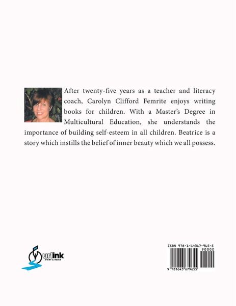 After twenty-five years as a teacher and literacy coach, Carolyn Clifford Femrite enjoys writing books for children. With a Master's Degree in Multicultural Education, she understands the importance of buildingself-esteem in all children. Beatrice is a story which instills the belief of inner beauty which we all possess.