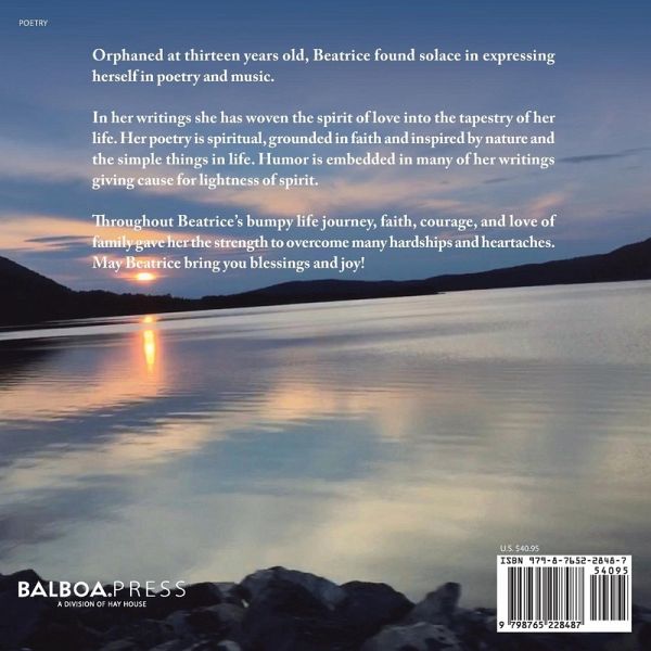 Orphaned at thirteen years old, Beatrice found solace in expressing herself in poetry and music. In her writings she has woven the spirit of love into the tapestry of her life. Her poetry is spiritual, grounded in faith and inspired by nature and the simple things in life. Humor is embedded in many of her writings giving cause for lightness of spirit. Throughout Beatrice's bumpy life journey, faith, courage, and love of family gave her the strength to overcome many hardships and heartaches. May Beatrice bring you blessings and joy!